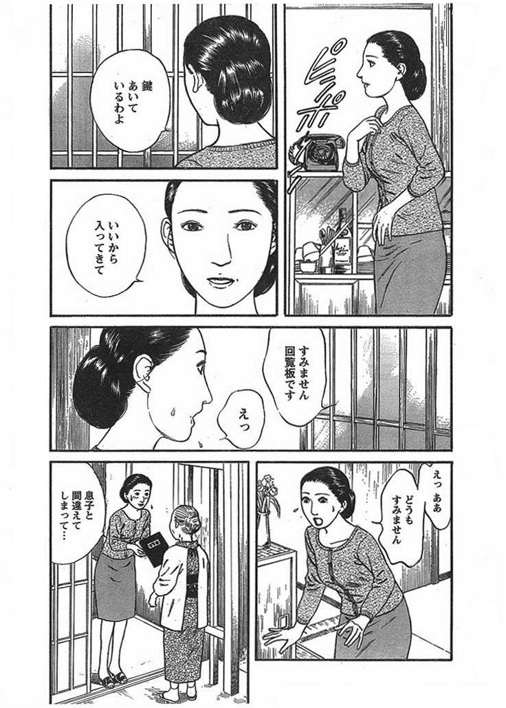 息子・利昭の友人・則夫と肉体関係を持ってしまった夫人。再び則夫は彼女の自宅を訪れるが、近所の老女が現れたため彼は家の裏側に隠れてしまう。その時、夫人がトイレへと向かう。その窓から思わず中を覗き込む則夫…。